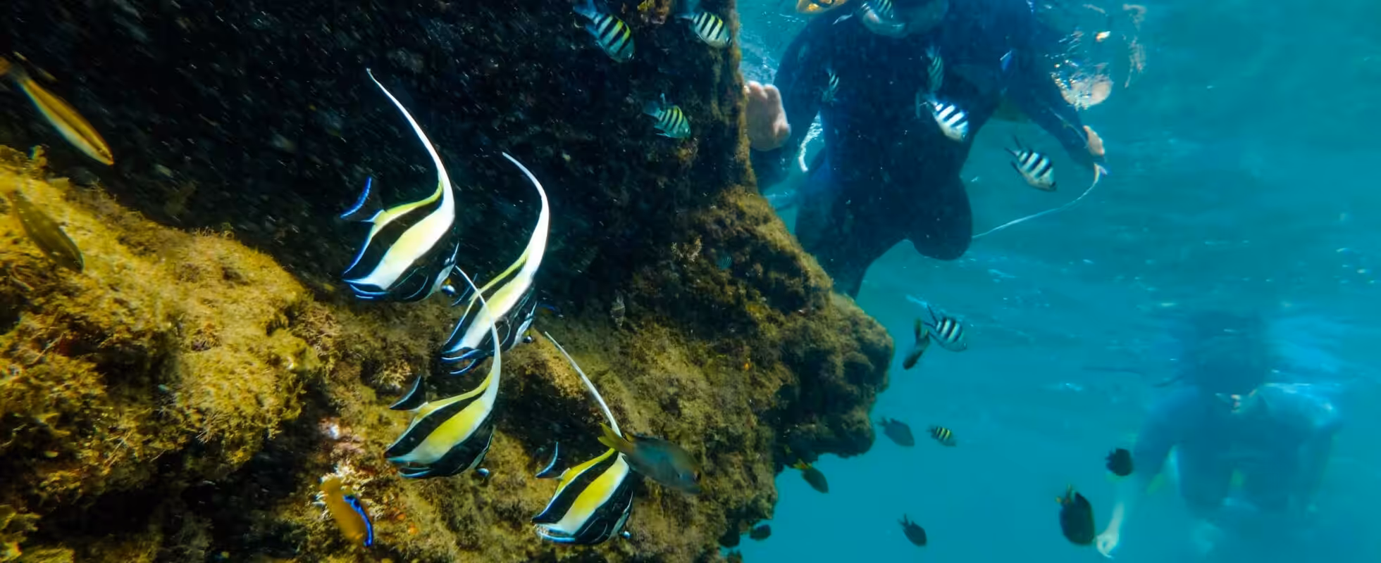 Cape Vidal är en orörd strand inom iSimangaliso Wetland Park, bara en timme från Saint Lucia, och en av de bästa platserna i landet för snorkling. Under en genomsnittlig utflykt kan du upptäcka fem typer av havssniglar och plattmaskar, samt 50 arter av fisk (tänk lionfish, ängelfisk, fjärilfisk, rockor och många fler). Lyckliga snorklare kan till och med få syn på sköldpaddor, bläckfiskar eller kullfiskar. Dagliga guidade turer är tidberoende (boka i förväg!) och leds av experter som vet exakt var fisken föder och hur man navigerar säkert runt strömmar. Den 2 timmar långa upplevelsen inkluderar all utrustning (fenor, mask, snorkel) och barn är välkomna. Och ingen stress – iSimangalisos marina liv trivs i ett hälsosamt ekosystem, så även om det skulle finnas några, skulle människor definitivt inte stå på en haijs meny!