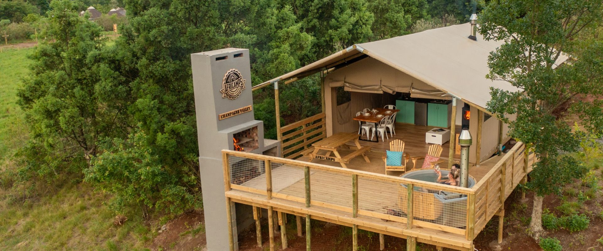 AfriCamps Champagne Valley ligger i hjärtat av Champagne Valley i centrala Drakensberg och erbjuder utsikt över bergen, frisk luft och en tältvistelse med mer än bara det grundläggande. Boutiquen har flera tält som rymmer upp till fem personer och har två sovrum, en öppen spis inomhus, ett fullt utrustat kök och ett eget badrum med en stor dusch. Det 30 kvadratmeter stora utomhusdäcket har ett picknickbord, solstolar, ett braaiområde och en vedeldad badtunna. Dessutom finns en spis med fyra brännare, mikrovågsugn och kylskåp, vilket gör självhushåll till en barnlek!