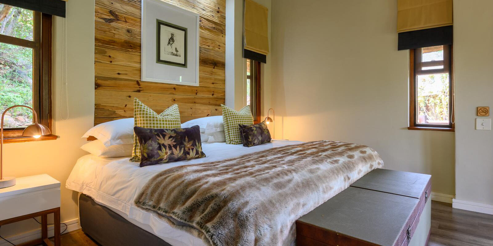 Bontle Game Lodge ligger i Welgevonden Game Reserve, strax innanför huvudingången i Limpopo-provinsen, endast 2,5 timmars bilresa från Johannesburgs O.R. Tambo International Airport. Denna exklusiva lodge erbjuder en femstjärnig upplevelse med lyxiga bekvämligheter och endast fem rum – inklusive en romantisk bröllopssvit – vilket skapar en intim och personlig atmosfär. Rummen har höga halmtak, traditionella dörrar med myggnät, takfläktar, privata utsiktsdäck samt eleganta badrum med badkar och utomhusdusch. Eftersom lodgen ligger nära djurstigar och en flod, är chansen stor att få se vilda djur som passerar precis utanför. Här kan du koppla av i poolen, ta en drink i baren eller vid elden, bläddra i kuriosaaffären och njuta av kulinariska läckerheter. Gästerna serveras tre måltider om dagen, tillagade av en privat kock, med menyer inspirerade av både afrikanska och internationella smaker.