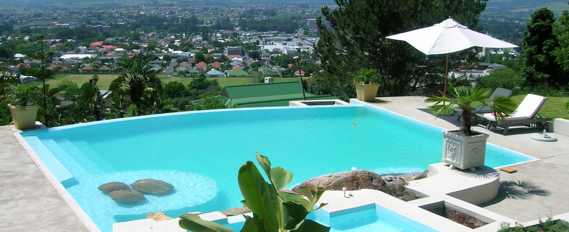Perle-du-Cap ligger vackert beläget på en kulle i Paarl – eller “Cape Winelands pärla”, som lokalbefolkningen gärna kallar det. Omgiven av frodig grönska och porlande vattenfall bjuder detta stilfulla B&B på en stillsam oas, bara några minuter från den historiska stadskärnan. Det höga läget garanterar inte bara lugn och ro, utan också hänförande utsikt över dalen och det majestätiska Paarl Mountain. Boendet erbjuder fem eleganta och hemtrevliga dubbelrum, alla med eget badrum och moderna bekvämligheter som luftkonditionering, WiFi, TV, minibar, kaffekokare och ett litet kylskåp. Starta dagen med en gourmetfrukost, ta ett dopp i den kristallklara infinitypoolen – som fylls av friskt källvatten direkt från berget – eller koppla av i solen på den generösa solterrassen.