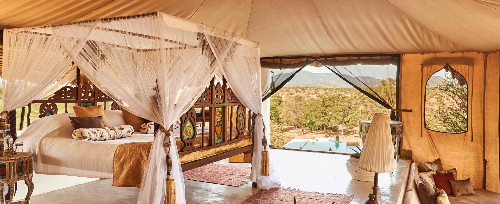 Sasaab Camp ligger spektakulärt uppe på en klippkant strax utanför Samburu National Reserve. Här bor du i någon av de nio rymliga tälten (inklusive en familjesvit), alla med höga halmtak, polerade betonggolv och en inredning som elegant blandar marockanska och swahiliska influenser. De ljusa tälten är hela 100 kvadratmeter stora och bjuder på fantastisk utsikt över Ewaso Nyiro-flodens stränder. Varje tält har en himmelssäng, ett badrum med dusch och en privat veranda med solsängar och en liten pool som är perfekt för att beskåda de imponerande elefanterna som gärna svalkar sig i floden.