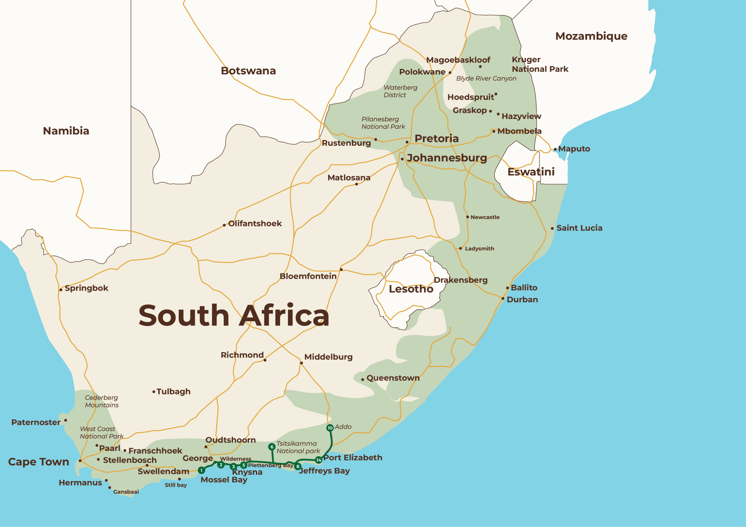 Garden Route imponerar inte bara historieälskare utan även naturfantaster. Vandra längs Kingfisher Trail och utforska Featherbed Nature Reserve där du kan beundra några av naturens mästerverk.